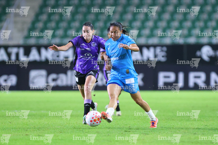 Mazatlán, Sinaloa, 12 de marzo de 2026. Alejandra Calderón y Yoselyn López, durante el partido correspondiente a la jornada 11 del torneo Clausura 2026 de la Liga BBVA MX Femenil, entre las Cañoneras del Mazatlán FC y las Rayadas del Monterrey, realizado en el estadio El Encanto. Foto: Imago7/ Juan Carlos Cubeyro.