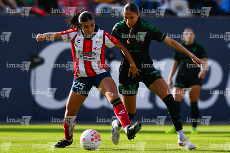 San Luis Potosí, San Luis Potosí, 22 de marzo de 2026. Izabelle Hernandez y Alexa Herrera, durante el partido correspondiente a la jornada 13 del torneo Clausura 2026 de la Liga BBVA MX Femenil, entre el Atlético San Luis y las Tigres de la UANL, realizado en el estadio Libertad Financiera. Foto: Imago7/ Hugo Martinez