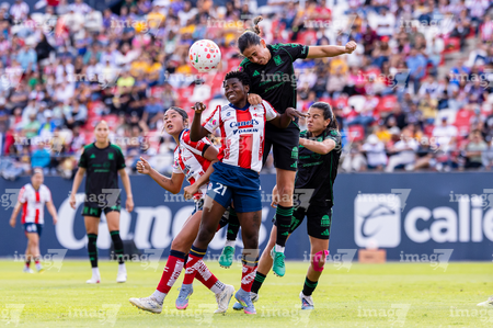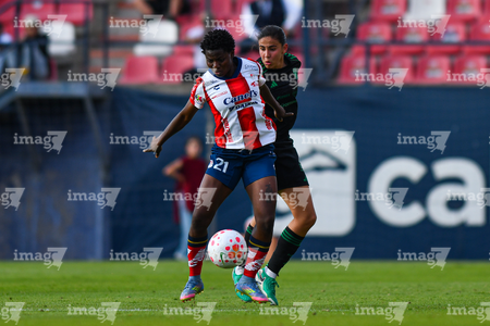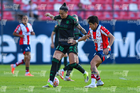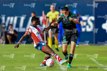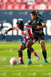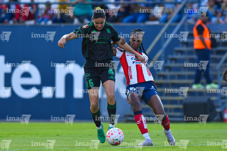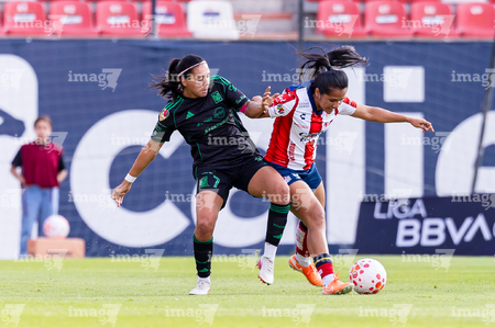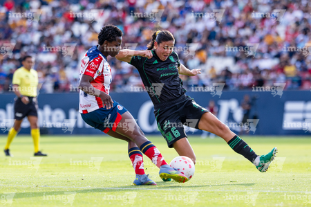 San Luis Potosí, San Luis Potosí, 22 de marzo de 2026. Farlyn Caicedo y Jimena López, durante el partido correspondiente a la jornada 13 del torneo Clausura 2026 de la Liga BBVA MX Femenil, entre el Atlético San Luis y las Tigres de la UANL, realizado en el estadio Libertad Financiera. Foto: Imago7/ Hugo Martinez