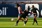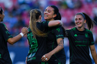 San Luis Potosí, San Luis Potosí, 22 de marzo de 2026. Jenni Hermoso y Karen Cano, durante el partido correspondiente a la jornada 13 del torneo Clausura 2026 de la Liga BBVA MX Femenil, entre el Atlético San Luis y las Tigres de la UANL, realizado en el estadio Libertad Financiera. Foto: Imago7/ Olimpia Puga
