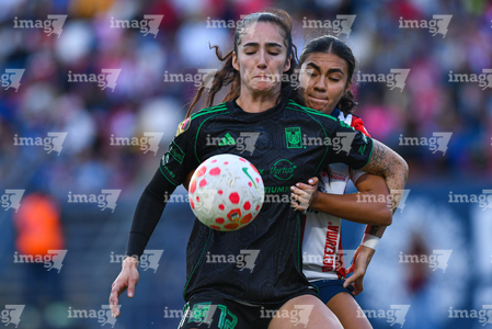 San Luis Potosí, San Luis Potosí, 22 de marzo de 2026. Jimena López y Farlyn Caicedo, durante el partido correspondiente a la jornada 13 del torneo Clausura 2026 de la Liga BBVA MX Femenil, entre el Atlético San Luis y las Tigres de la UANL, realizado en el estadio Libertad Financiera. Foto: Imago7/ Olimpia Puga