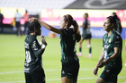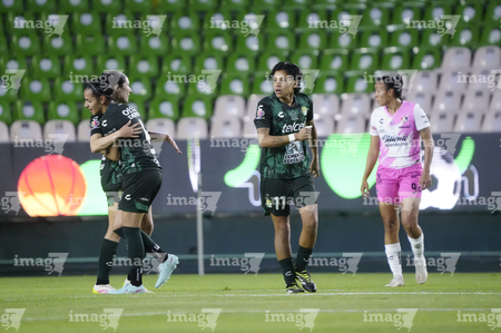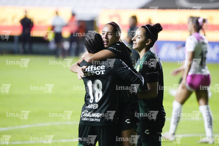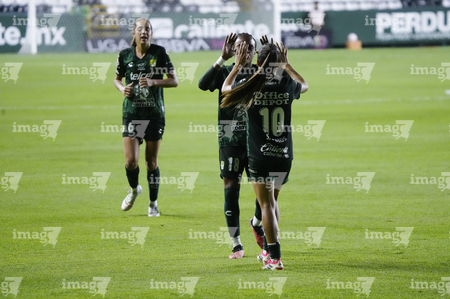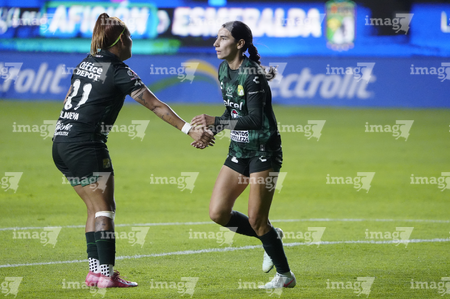 León, Guanajuato, 23 de marzo de 2026. Solange Lemos y Marissa García en festejo de gol, durante el partido correspondiente a la jornada 13 del torneo Clausura 2026 de la Liga BBVA MX Femenil, entre las Esmeraldas del León y las Rojinegras del Atlas, realizado en el estadio León. Foto: Imago7/ Sebastian Laureano Miranda