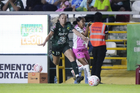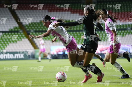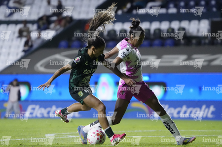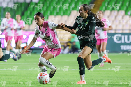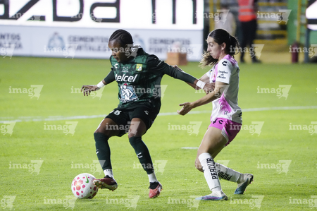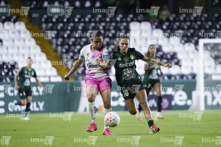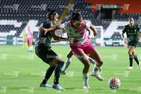 León, Guanajuato, 23 de marzo de 2026. Dirce Delgado y Solange Lemos, durante el partido correspondiente a la jornada 13 del torneo Clausura 2026 de la Liga BBVA MX Femenil, entre las Esmeraldas del León y las Rojinegras del Atlas, realizado en el estadio León. Foto: Imago7/ Sebastian Laureano Miranda