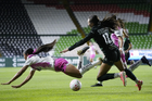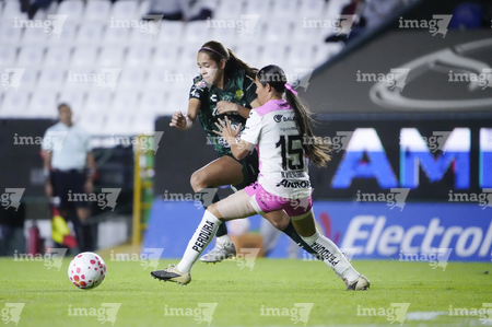 León, Guanajuato, 23 de marzo de 2026. Valeria Razo y Brenda Ceren, durante el partido correspondiente a la jornada 13 del torneo Clausura 2026 de la Liga BBVA MX Femenil, entre las Esmeraldas del León y las Rojinegras del Atlas, realizado en el estadio León. Foto: Imago7/ Sebastian Laureano Miranda