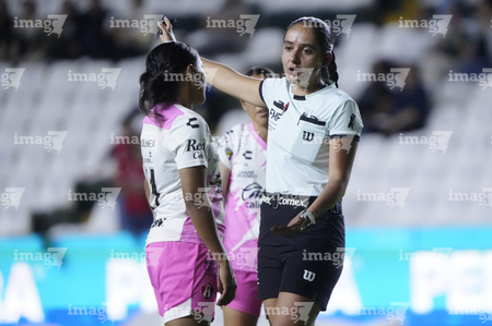 León, Guanajuato, 23 de marzo de 2026. Montserrat Pérez Comellas, árbitra central, durante el partido correspondiente a la jornada 13 del torneo Clausura 2026 de la Liga BBVA MX Femenil, entre las Esmeraldas del León y las Rojinegras del Atlas, realizado en el estadio León. Foto: Imago7/ Sebastian Laureano Miranda