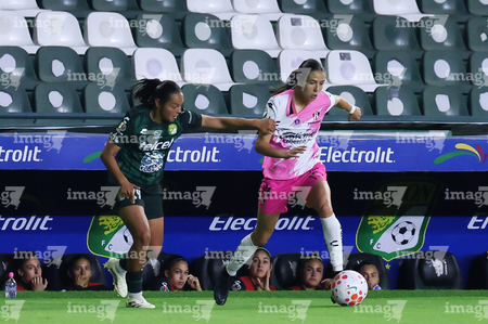 León, Guanajuato, 23 de marzo de 2026. Valeria Razo y Maritza Maldonado, durante el partido correspondiente a la jornada 13 del torneo Clausura 2026 de la Liga BBVA MX Femenil, entre las Esmeraldas del León y las Rojinegras del Atlas, realizado en el estadio León. Foto: Imago7/ Sebastian Laureano Miranda
