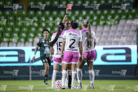 León, Guanajuato, 23 de marzo de 2026. Montserrat Pérez Comellas, árbitra central muestra tarjeta roja de expulsión, durante el partido correspondiente a la jornada 13 del torneo Clausura 2026 de la Liga BBVA MX Femenil, entre las Esmeraldas del León y las Rojinegras del Atlas, realizado en el estadio León. Foto: Imago7/ Sebastian Laureano Miranda