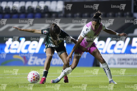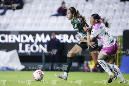 León, Guanajuato, 23 de marzo de 2026. Valeria Razo y Dirce Delgado, durante el partido correspondiente a la jornada 13 del torneo Clausura 2026 de la Liga BBVA MX Femenil, entre las Esmeraldas del León y las Rojinegras del Atlas, realizado en el estadio León. Foto: Imago7/ Sebastian Laureano Miranda