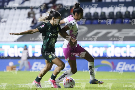 León, Guanajuato, 23 de marzo de 2026. Noemí Villalobos y Chelsea Lien, durante el partido correspondiente a la jornada 13 del torneo Clausura 2026 de la Liga BBVA MX Femenil, entre las Esmeraldas del León y las Rojinegras del Atlas, realizado en el estadio León. Foto: Imago7/ Israel Lopez