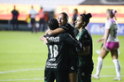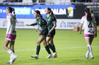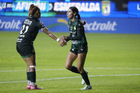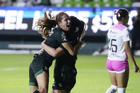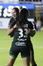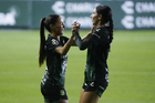 León, Guanajuato, 23 de marzo de 2026. Trudi Carter y Solange Lemos en festejo de gol, durante el partido correspondiente a la jornada 13 del torneo Clausura 2026 de la Liga BBVA MX Femenil, entre las Esmeraldas del León y las Rojinegras del Atlas, realizado en el estadio León. Foto: Imago7/ Sebastian Laureano Miranda