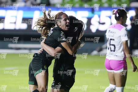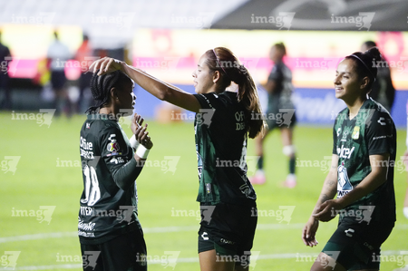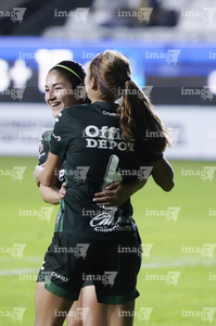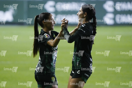 León, Guanajuato, 23 de marzo de 2026. Alexia Villanueva y Marissa García en festejo de gol, durante el partido correspondiente a la jornada 13 del torneo Clausura 2026 de la Liga BBVA MX Femenil, entre las Esmeraldas del León y las Rojinegras del Atlas, realizado en el estadio León. Foto: Imago7/ Israel Lopez