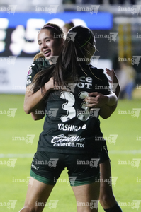 León, Guanajuato, 23 de marzo de 2026. Yashira Barrientos y Valeria Razo en festejo de gol, durante el partido correspondiente a la jornada 13 del torneo Clausura 2026 de la Liga BBVA MX Femenil, entre las Esmeraldas del León y las Rojinegras del Atlas, realizado en el estadio León. Foto: Imago7/ Sebastian Laureano Miranda