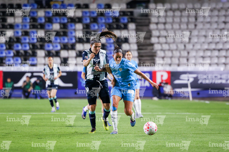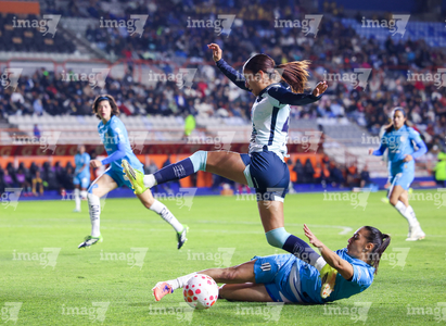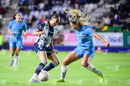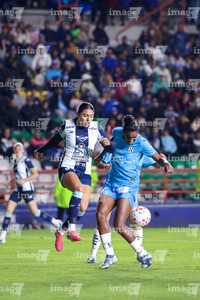 Pachuca, Hidalgo, 27 de marzo de 2026. Karol Bernal y Aline Gomes, durante el partido correspondiente a la jornada 14 del torneo Clausura 2026 de la Liga BBVA MX Femenil, entre las Tuzas del Pachuca y las Rayadas del Monterrey, realizado en el estadio Hidalgo. Foto: Imago7/ Alexis Chavez