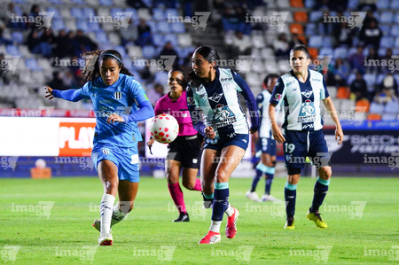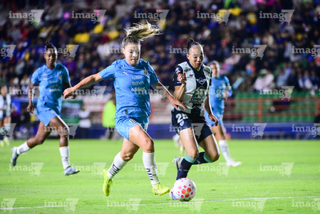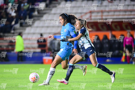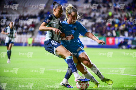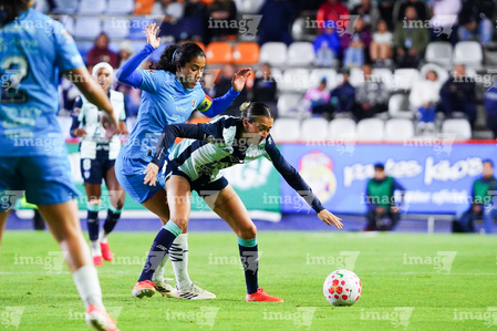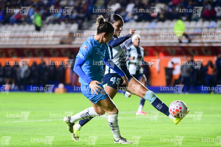 Pachuca, Hidalgo, 27 de marzo de 2026. Allison Veloz y Berenice Ibarra, durante el partido correspondiente a la jornada 14 del torneo Clausura 2026 de la Liga BBVA MX Femenil, entre las Tuzas del Pachuca y las Rayadas del Monterrey, realizado en el estadio Hidalgo. Foto: Imago7/ Alexis Chavez