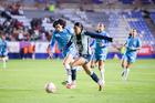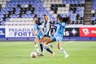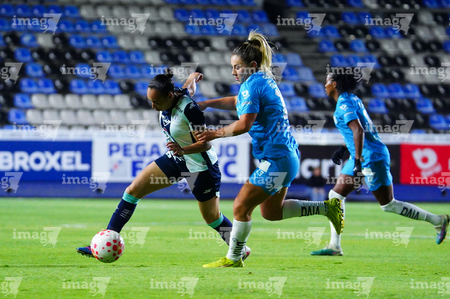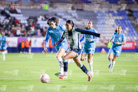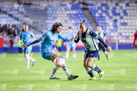 Pachuca, Hidalgo, 27 de marzo de 2026. Valerie Vargas y Berenice Ibarra, durante el partido correspondiente a la jornada 14 del torneo Clausura 2026 de la Liga BBVA MX Femenil, entre las Tuzas del Pachuca y las Rayadas del Monterrey, realizado en el estadio Hidalgo. Foto: Imago7/ Alexis Chavez