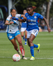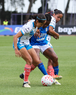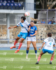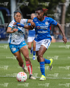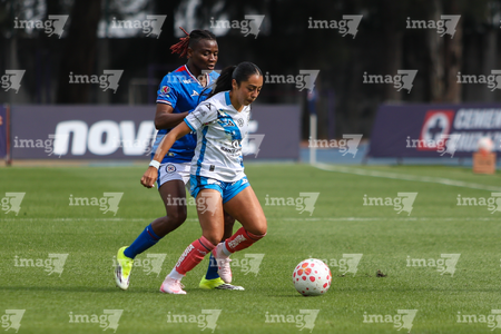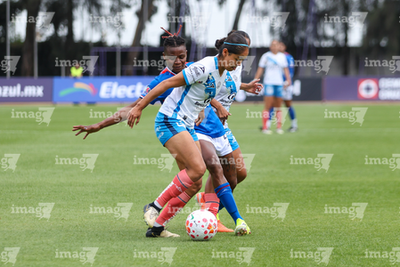 Cuernavaca, Morelos, 28 de marzo de 2026. Yulexi Diaz y Ana García, durante el partido correspondiente a la jornada 14 del torneo Clausura 2026 de la Liga BBVA MX Femenil, entre la Máquina Celeste del Cruz Azul y el Club Puebla, realizado en el estadio de la Unidad Deportiva Centenario. Foto: Imago7/ Daniel Sydney