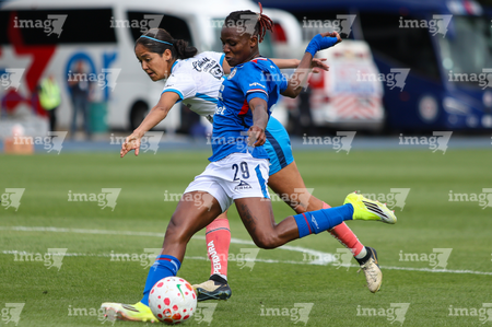 Cuernavaca, Morelos, 28 de marzo de 2026. Uchenna Kanu y Abigail López, durante el partido correspondiente a la jornada 14 del torneo Clausura 2026 de la Liga BBVA MX Femenil, entre la Máquina Celeste del Cruz Azul y el Club Puebla, realizado en el estadio de la Unidad Deportiva Centenario. Foto: Imago7/ Daniel Sydney