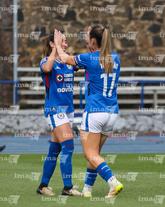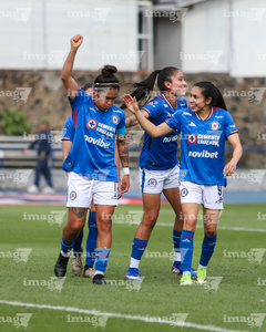 Cuernavaca, Morelos, 28 de marzo de 2026. Jugadoras de Cruz Azul en festejo de gol, durante el partido correspondiente a la jornada 14 del torneo Clausura 2026 de la Liga BBVA MX Femenil, entre la Máquina Celeste del Cruz Azul y el Club Puebla, realizado en el estadio de la Unidad Deportiva Centenario. Foto: Imago7/ Daniel Sydney