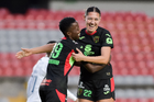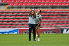 Querétaro, Querétaro, 29 de marzo de 2026. Bianca Mora y Oscar Fernández, director técnico en festejo de gol, durante el partido correspondiente a la jornada 14 del torneo Clausura 2026 de la Liga BBVA MX Femenil, entre el Club Querétaro y las Bravas de FC Juárez, realizado en el estadio La Corregidora. Foto: Imago7/ Hugo Martinez