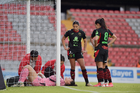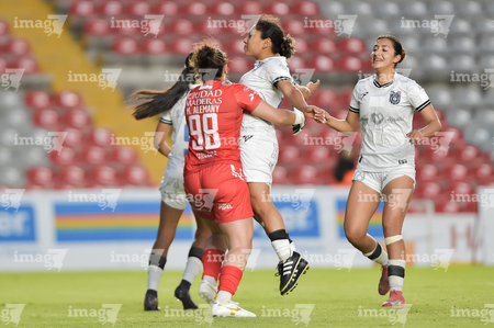 Querétaro, Querétaro, 29 de marzo de 2026. Emily Alvarado recibe gol, durante el partido correspondiente a la jornada 14 del torneo Clausura 2026 de la Liga BBVA MX Femenil, entre el Club Querétaro y las Bravas de FC Juárez, realizado en el estadio La Corregidora. Foto: Imago7/ Olimpia Puga