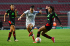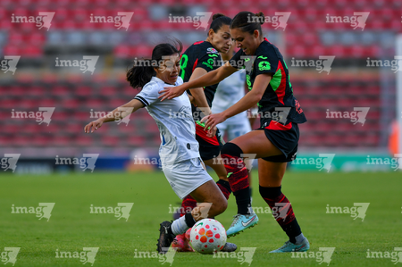 Querétaro, Querétaro, 29 de marzo de 2026. Edith Carmona, Aurelie Kaci y Ella Sanchez, durante el partido correspondiente a la jornada 14 del torneo Clausura 2026 de la Liga BBVA MX Femenil, entre el Club Querétaro y las Bravas de FC Juárez, realizado en el estadio La Corregidora. Foto: Imago7/ Olimpia Puga