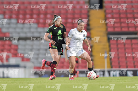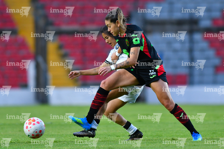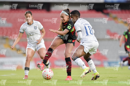 Querétaro, Querétaro, 29 de marzo de 2026. Victoria Ceceña y Aurelie Kaci, durante el partido correspondiente a la jornada 14 del torneo Clausura 2026 de la Liga BBVA MX Femenil, entre el Club Querétaro y las Bravas de FC Juárez, realizado en el estadio La Corregidora. Foto: Imago7/ Hugo Martinez