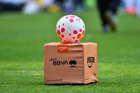 Querétaro, Querétaro, 29 de marzo de 2026. Balón de futbol Nike Control sobre caja de Amazon durante el partido correspondiente a la jornada 14 del torneo Clausura 2026 de la Liga BBVA MX Femenil, entre el Club Querétaro y las Bravas de FC Juárez, realizado en el estadio La Corregidora. Foto: Imago7/ Olimpia Puga
