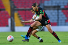 Querétaro, Querétaro, 29 de marzo de 2026. Karime Abud (D), durante el partido correspondiente a la jornada 14 del torneo Clausura 2026 de la Liga BBVA MX Femenil, entre el Club Querétaro y las Bravas de FC Juárez, realizado en el estadio La Corregidora. Foto: Imago7/ Hugo Martinez
