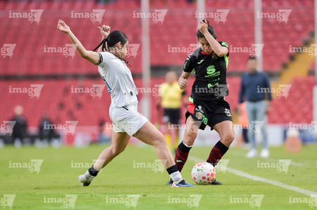 Querétaro, Querétaro, 29 de marzo de 2026. Noemí Granados y Marianyela Jiménez, durante el partido correspondiente a la jornada 14 del torneo Clausura 2026 de la Liga BBVA MX Femenil, entre el Club Querétaro y las Bravas de FC Juárez, realizado en el estadio La Corregidora. Foto: Imago7/ Hugo Martinez