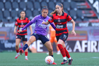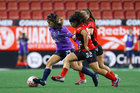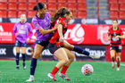 Tijuana, Baja California, 29 de marzo de 2026. Denise Castro y Michel Fong, durante el partido correspondiente a la jornada 14 del torneo Clausura 2026 de la Liga BBVA MX Femenil, entre las Xolas de Tijuana y las Chivas Rayadas del Guadalajara, realizado en el estadio Caliente. Foto: Imago7/Agustín Reyes
