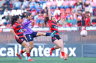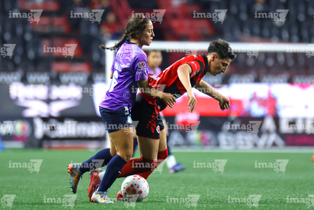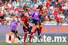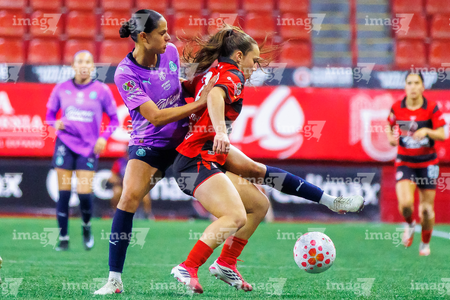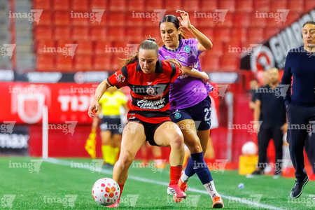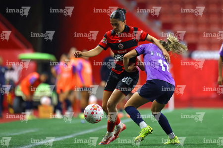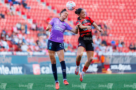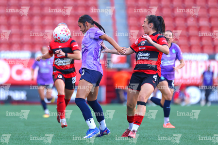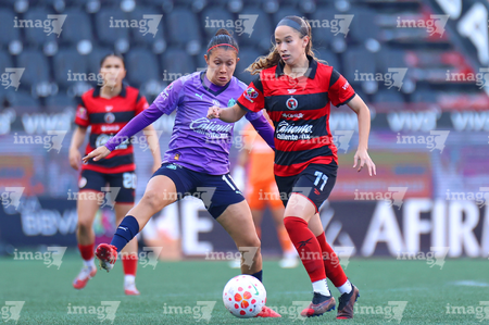Tijuana, Baja California, 29 de marzo de 2026. Joseline Montoya y Naomi Rojo, durante el partido correspondiente a la jornada 14 del torneo Clausura 2026 de la Liga BBVA MX Femenil, entre las Xolas de Tijuana y las Chivas Rayadas del Guadalajara, realizado en el estadio Caliente. Foto: Imago7/ David Vega