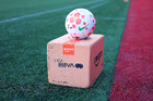 Tijuana, Baja California, 29 de marzo de 2026. Balón de futbol Nike Control sobre caja de Amazon, durante el partido correspondiente a la jornada 14 del torneo Clausura 2026 de la Liga BBVA MX Femenil, entre las Xolas de Tijuana y las Chivas Rayadas del Guadalajara, realizado en el estadio Caliente. Foto: Imago7/ David Vega