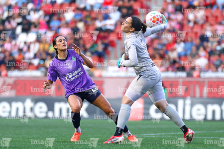 Tijuana, Baja California, 29 de marzo de 2026. Michel Fong y Jasmine Casarez, durante el partido correspondiente a la jornada 14 del torneo Clausura 2026 de la Liga BBVA MX Femenil, entre las Xolas de Tijuana y las Chivas Rayadas del Guadalajara, realizado en el estadio Caliente. Foto: Imago7/Agustín Reyes