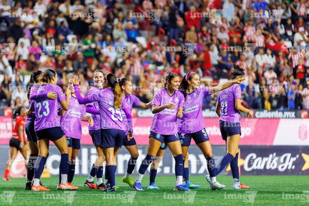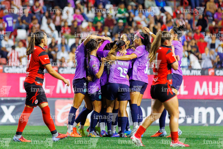 Tijuana, Baja California, 29 de marzo de 2026. Jugadoras de Chivas femenil en festejo de gol, durante el partido correspondiente a la jornada 14 del torneo Clausura 2026 de la Liga BBVA MX Femenil, entre las Xolas de Tijuana y las Chivas Rayadas del Guadalajara, realizado en el estadio Caliente. Foto: Imago7/Agustín Reyes