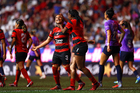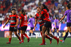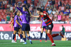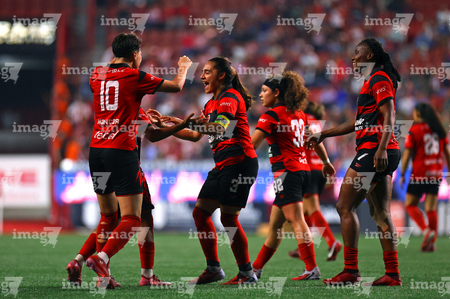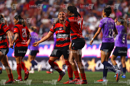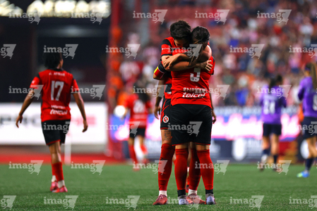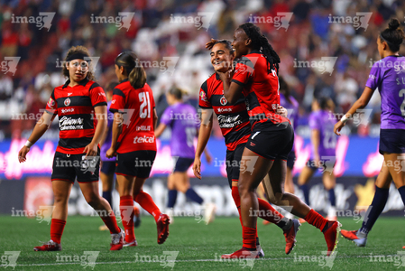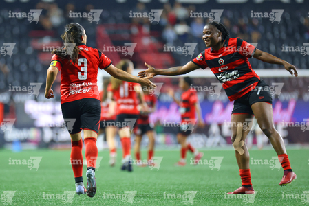 Tijuana, Baja California, 29 de marzo de 2026. Jazmín Enrigue y Roselord Borgella en festejo de gol, durante el partido correspondiente a la jornada 14 del torneo Clausura 2026 de la Liga BBVA MX Femenil, entre las Xolas de Tijuana y las Chivas Rayadas del Guadalajara, realizado en el estadio Caliente. Foto: Imago7/ David Vega