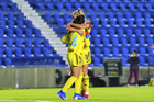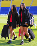 Ciudad de México, 1 de abril de 2026. Jaquelín García y Gabriela García, durante el partido correspondiente a la jornada 15 del torneo Clausura 2026 de la Liga BBVA MX Femenil, entre las Águilas del América y las Rojinegras del Atlas, realizado en el estadio Ciudad de los Deportes. Foto: Imago7/ Alexis Chavez