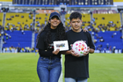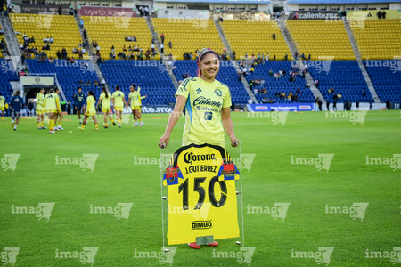 Ciudad de México, 1 de abril de 2026. Jana Gutiérrez recibe reconocimiento por sus 150 partidos, durante el partido correspondiente a la jornada 15 del torneo Clausura 2026 de la Liga BBVA MX Femenil, entre las Águilas del América y las Rojinegras del Atlas, realizado en el estadio Ciudad de los Deportes. Foto: Imago7/ Alexis Chavez