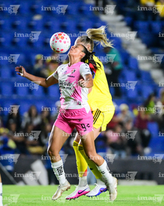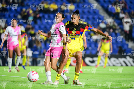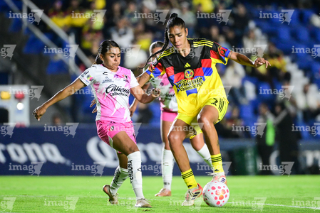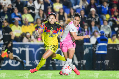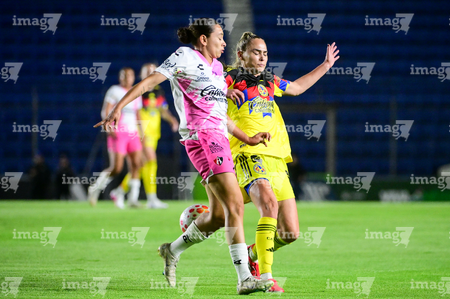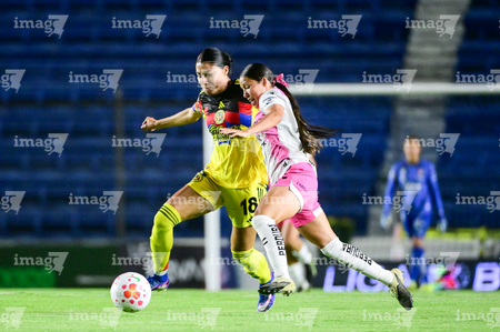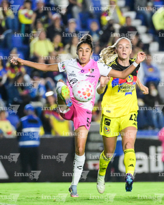 Ciudad de México, 1 de abril de 2026. Jana Gutiérrez y Dirce Delgado, durante el partido correspondiente a la jornada 15 del torneo Clausura 2026 de la Liga BBVA MX Femenil, entre las Águilas del América y las Rojinegras del Atlas, realizado en el estadio Ciudad de los Deportes. Foto: Imago7/ Alexis Chavez
