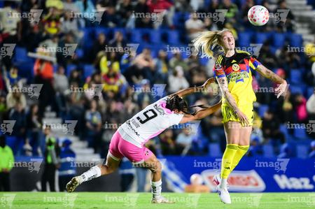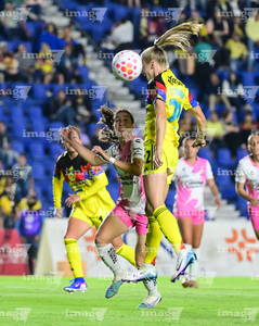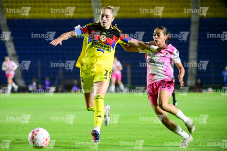 Ciudad de México, 1 de abril de 2026. Sanjuana Muñoz y Sarah Luebbert, durante el partido correspondiente a la jornada 15 del torneo Clausura 2026 de la Liga BBVA MX Femenil, entre las Águilas del América y las Rojinegras del Atlas, realizado en el estadio Ciudad de los Deportes. Foto: Imago7/ Alexis Chavez