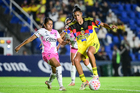 Ciudad de México, 1 de abril de 2026. Daniela Meza y Alondra Cardona, durante el partido correspondiente a la jornada 15 del torneo Clausura 2026 de la Liga BBVA MX Femenil, entre las Águilas del América y las Rojinegras del Atlas, realizado en el estadio Ciudad de los Deportes. Foto: Imago7/Carlos Vargas