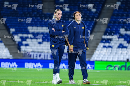 Guadalupe, Nuevo León, 1 de abril de 2026. Lucía García y Fátima Delgado, durante el partido correspondiente a la jornada 15 del torneo Clausura 2026 de la Liga BBVA MX Femenil, entre las Rayadas del Monterrey y las Pumas de la UNAM, realizado en el estadio BBVA. Foto: Imago7/