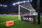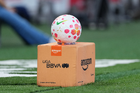 Guadalupe, Nuevo León, 1 de abril de 2026. Balón de futbol Nike Control sobre caja de Amazon, durante el partido correspondiente a la jornada 15 del torneo Clausura 2026 de la Liga BBVA MX Femenil, entre las Rayadas del Monterrey y las Pumas de la UNAM, realizado en el estadio BBVA. Foto: Imago7/