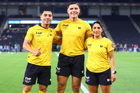 Guadalupe, Nuevo León, 1 de abril de 2026. Brayan Arturo Sosa, árbitro asistente, Alfredo Huerta López, árbitro central y Karla Anaid Hurtado, árbitra asistente, durante el partido correspondiente a la jornada 15 del torneo Clausura 2026 de la Liga BBVA MX Femenil, entre las Rayadas del Monterrey y las Pumas de la UNAM, realizado en el estadio BBVA. Foto: Imago7/ David Arzamendi