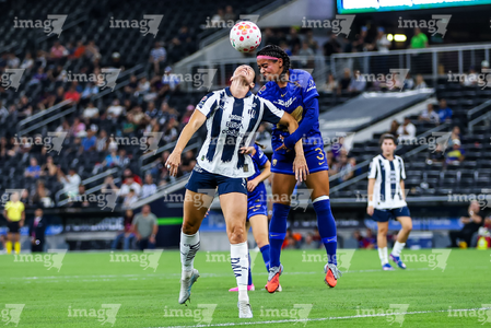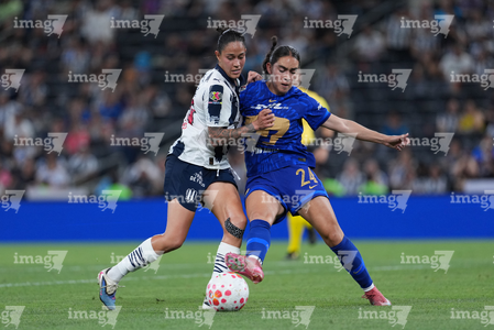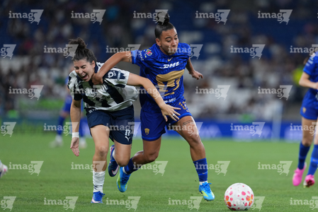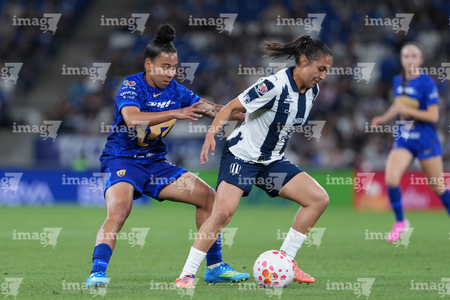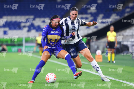 Guadalupe, Nuevo León, 1 de abril de 2026. Nayely Bolaños y Marcela Restrepo, durante el partido correspondiente a la jornada 15 del torneo Clausura 2026 de la Liga BBVA MX Femenil, entre las Rayadas del Monterrey y las Pumas de la UNAM, realizado en el estadio BBVA. Foto: Imago7/
