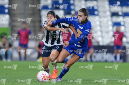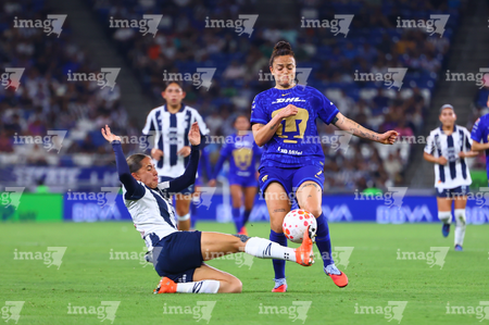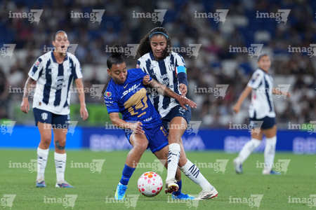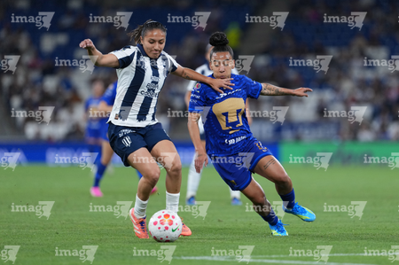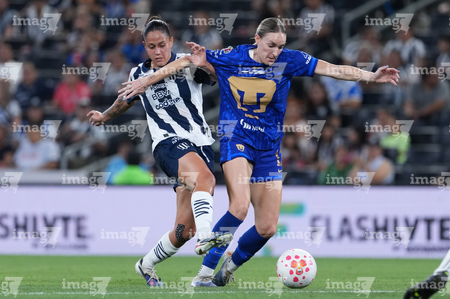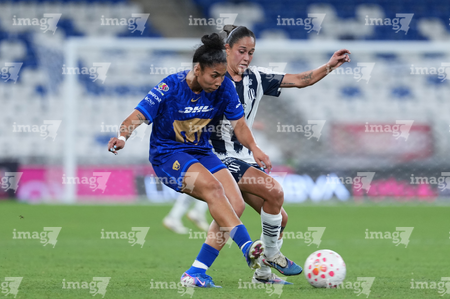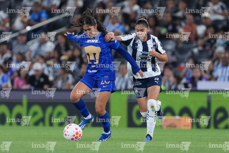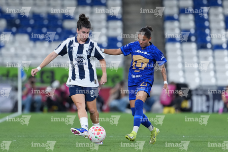 Guadalupe, Nuevo León, 1 de abril de 2026. Daniela Monroy y Wendy Bonilla, durante el partido correspondiente a la jornada 15 del torneo Clausura 2026 de la Liga BBVA MX Femenil, entre las Rayadas del Monterrey y las Pumas de la UNAM, realizado en el estadio BBVA. Foto: Imago7/