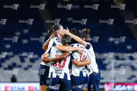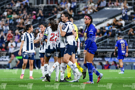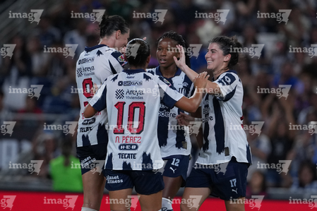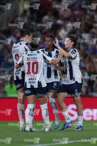Guadalupe, Nuevo León, 1 de abril de 2026. Jugadoras de Rayadas en festejo de gol, durante el partido correspondiente a la jornada 15 del torneo Clausura 2026 de la Liga BBVA MX Femenil, entre las Rayadas del Monterrey y las Pumas de la UNAM, realizado en el estadio BBVA. Foto: Imago7/
