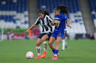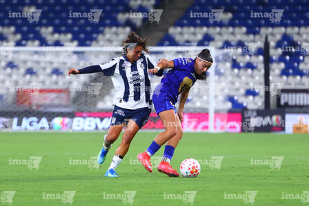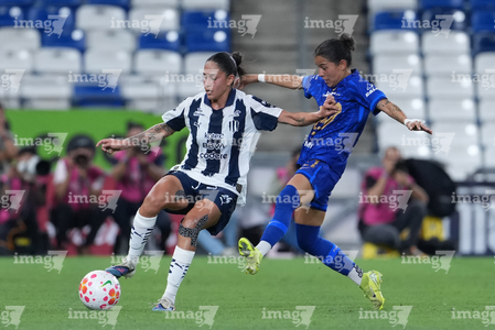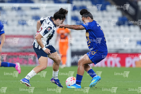 Guadalupe, Nuevo León, 1 de abril de 2026. Tanna Sánchez y Stephanie Ribeiro, durante el partido correspondiente a la jornada 15 del torneo Clausura 2026 de la Liga BBVA MX Femenil, entre las Rayadas del Monterrey y las Pumas de la UNAM, realizado en el estadio BBVA. Foto: Imago7/ David Arzamendi