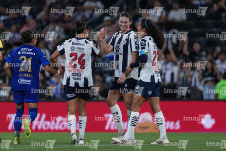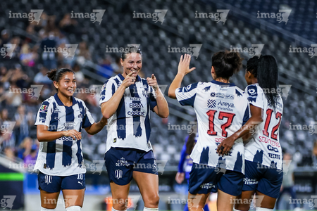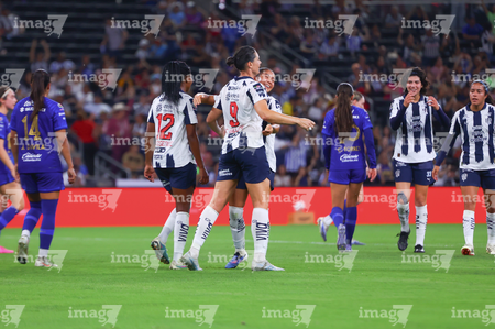 Guadalupe, Nuevo León, 1 de abril de 2026. Marcela Restrepo, Emily Gielnik y Diana García en festejo de gol, durante el partido correspondiente a la jornada 15 del torneo Clausura 2026 de la Liga BBVA MX Femenil, entre las Rayadas del Monterrey y las Pumas de la UNAM, realizado en el estadio BBVA. Foto: Imago7/