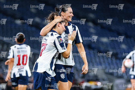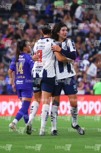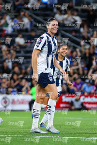 Guadalupe, Nuevo León, 1 de abril de 2026. Emily Gielnik y Carol Cázares en festejo de gol, durante el partido correspondiente a la jornada 15 del torneo Clausura 2026 de la Liga BBVA MX Femenil, entre las Rayadas del Monterrey y las Pumas de la UNAM, realizado en el estadio BBVA. Foto: Imago7/