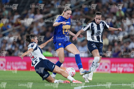 Guadalupe, Nuevo León, 1 de abril de 2026. Daniela Monroy, Angelina Hix y Valeria Del Campo, durante el partido correspondiente a la jornada 15 del torneo Clausura 2026 de la Liga BBVA MX Femenil, entre las Rayadas del Monterrey y las Pumas de la UNAM, realizado en el estadio BBVA. Foto: Imago7/